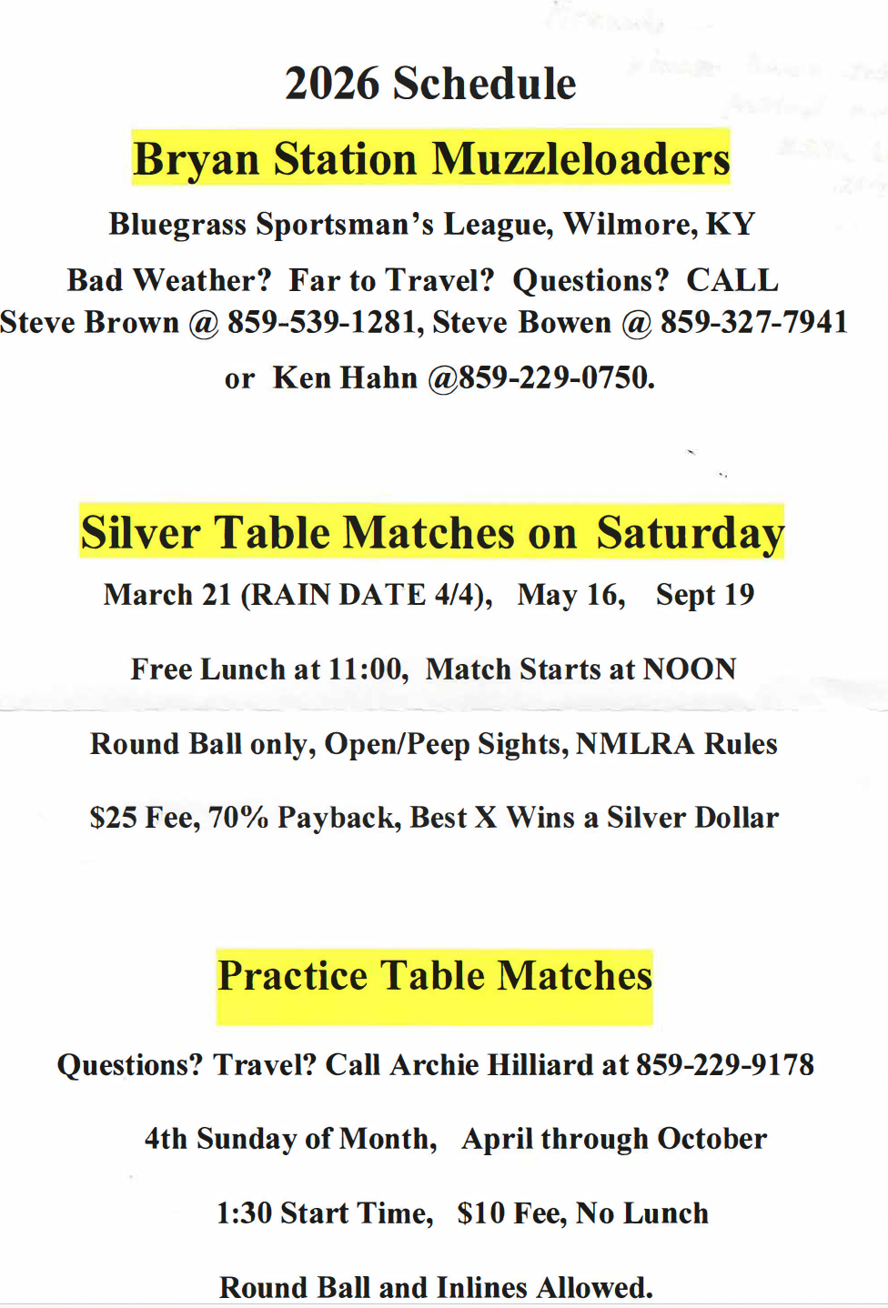 For more information on range use, matches, to confirm a match, etc., email muzzleloader@bgslinc.com or call Gerry Schlenker @ 859-699-6084, Ken Hahn @ 859-229-0750, or Steve Brown @ 859-539-1281.